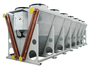 Данное оборудование представляет собой теплообменный аппарат, в котором происходит фазовый переход хладагента из парообразного состояния в жидкое за счет передачи теплоты охлаждающей среде. В качестве теплообменников используются поверхностные воздухоохладители, состоящие из медных трубок, на которые смонтированы гофрированные пластины из алюминия, создающие оребрение. Для уменьшения габаритов теплообменного аппарата, наружная поверхность трубок с оребрением обдувается высокоскоростным потоком воздуха, создаваемым осевыми вентиляторами.
