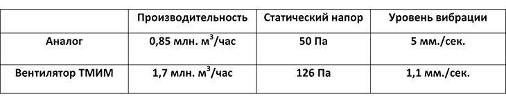 При пуске в эксплуатацию вентиляторного оборудования ООО "ТМИМ", исходя из отчётов по пусконаладочным работам были достигнуты показатели: